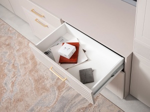 Фасады тумбы характеризуются уникальной композицией, которая достигается благодаря применению передовых технологий в области дизайна и мебельного производства. Особое внимание уделено структурным элементам, обеспечивающим визуальную гармонию и тактильное восприятие.
