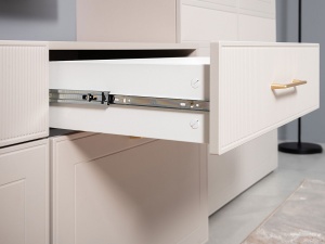 Шариковые направляющие (телескопические) - в них используются металлические шарики наподобие тех, что применяются в подшипниках. Есть варианты с доводчиками и без. Плюсы: бесшумное скольжение и плавный ход, полное выдвижение. Минусы: сложность демонтажа/монтажа ящика, цена, требуется смазка.