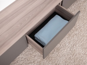 Конструктивные особенности тумбы включают два вместительных выдвижных ящика, обеспечивающих эффективное использование пространства для хранения. Эти элементы дизайна способствуют рациональной организации хранения, что является ключевым аспектом для создания функционального и эстетически привлекательного интерьера.