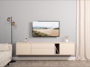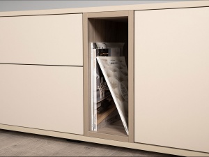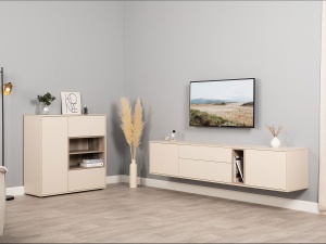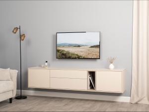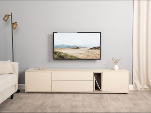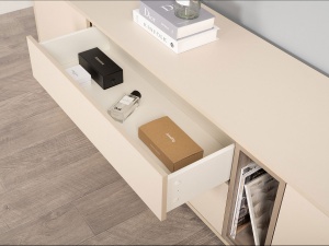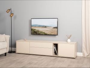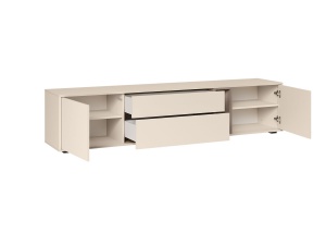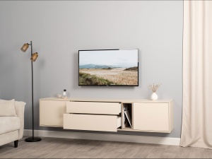 Комплект поставки включает в себя два вместительных ящика, оснащённых push-механизмом и скрытыми направляющими, что способствует бесшумного закрыванию и обеспечивает долговечность конструкции. Распашные дверцы оснащены доводчиком и системой открывания push-to-open, что придаёт изделию дополнительную эргономичность и удобство использования. Внутреннее пространство тумбы оборудовано удобными полками для хранения мелких предметов или кабелей, что способствует поддержанию порядка и организации пространства.