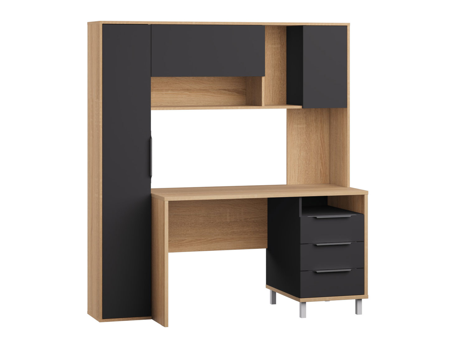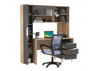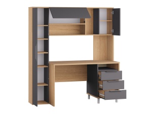 Конструктивная особенность стола заключается в наличии надстройки, оснащенной открытыми и закрытыми полками, что позволяет рационально использовать вертикальное пространство и обеспечивает удобство хранения различных предметов.
