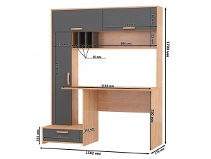 Конструктивная основа стола включает закрытый вертикальный блок с тремя полками, выдвижной ящик и две объемные ниши с откидными дверцами, что обеспечивает функциональность и рациональное использование пространства. Дополнительно система оснащена большой открытой полкой с отсеками для хранения документов, что способствует оптимизации рабочего процесса и поддержанию порядка.