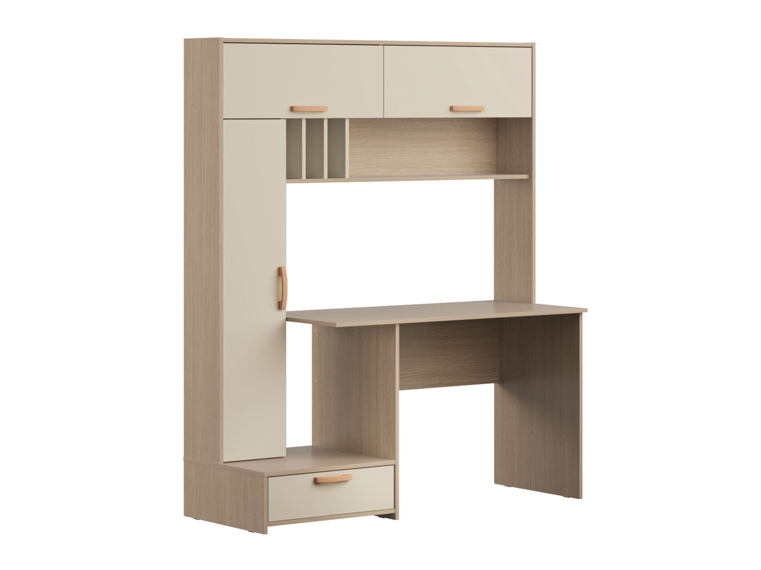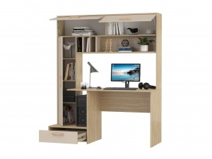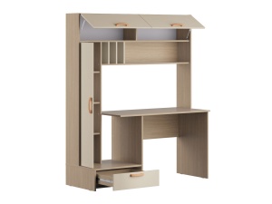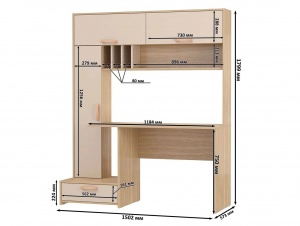 Конструктивная основа стола включает закрытый вертикальный блок с тремя полками, выдвижной ящик и две объемные ниши с откидными дверцами, что обеспечивает функциональность и рациональное использование пространства. Дополнительно система оснащена большой открытой полкой с отсеками для хранения документов, что способствует оптимизации рабочего процесса и поддержанию порядка.