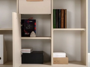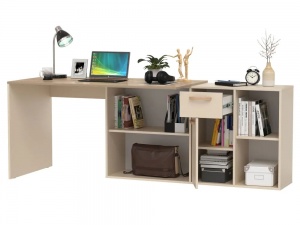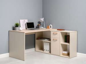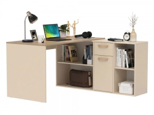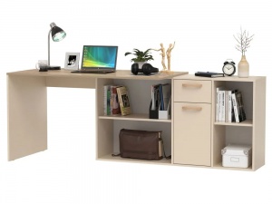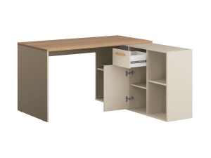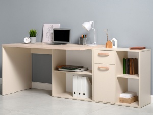 Система хранения стола разработана с учетом современных требований к функциональности и эргономике. Тумба оснащена четырьмя открытыми нишами различного размера, что позволяет гибко адаптировать пространство под индивидуальные нужды. Встроенный закрытый шкафчик с полкой внутри предоставляет дополнительное место для хранения, а выдвижной ящик на шариковых направляющих полного выдвижения обеспечивает быстрый и удобный доступ к необходимым предметам. Такая компоновка способствует эффективному управлению рабочим пространством и поддержанию порядка.