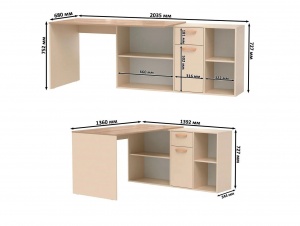 Геометрические параметры стола варьируются в зависимости от конфигурации: в положении "прямой" - 2035х680х752 мм, в положении "угловой" - 1360х1392х752 мм. Универсальность схемы сборки позволяет адаптировать стол к различным архитектурным решениям, обеспечивая гибкость и адаптивность конструкции.