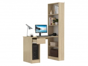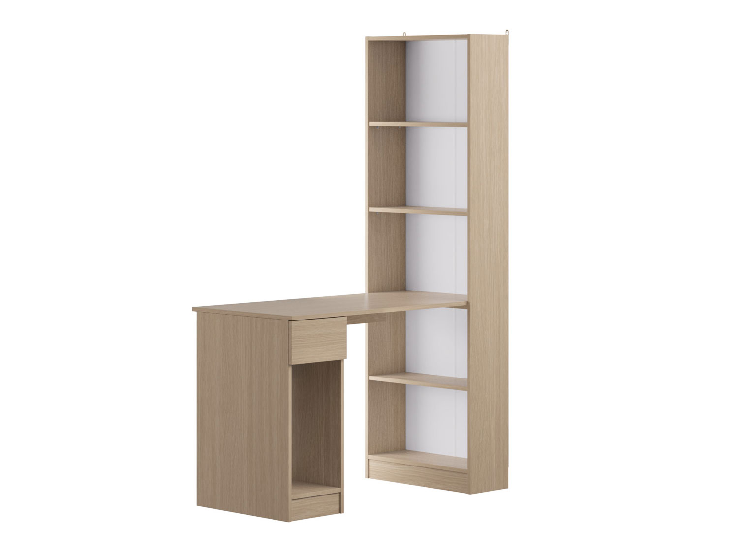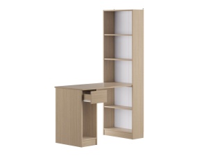 Конструкция шкафа включает вместительный открытый стеллаж, предназначенный для хранения документов, книг и других офисных принадлежностей. Письменный стол, выполненный в эргономичном дизайне, оснащен выдвижным ящиком с шариковыми направляющими полного выдвижения, что обеспечивает удобный доступ к содержимому. Дополнительно предусмотрена ниша под системный блок, что делает модель пригодной для использования в качестве домашнего офиса или рабочего места для школьника.