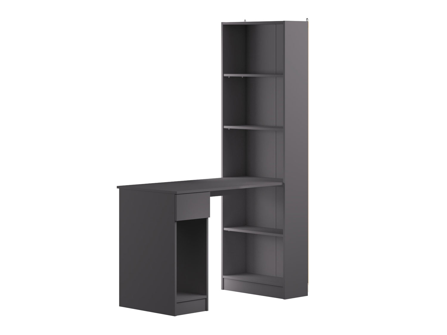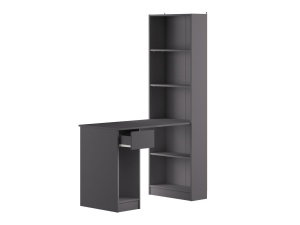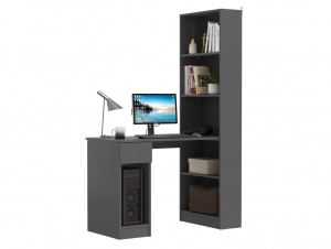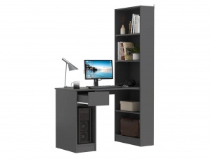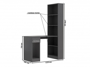 Конструкция шкафа включает вместительный открытый стеллаж, предназначенный для хранения документов, книг и других офисных принадлежностей. Письменный стол, выполненный в эргономичном дизайне, оснащен выдвижным ящиком с шариковыми направляющими полного выдвижения, что обеспечивает удобный доступ к содержимому. Дополнительно предусмотрена ниша под системный блок, что делает модель пригодной для использования в качестве домашнего офиса или рабочего места для школьника.