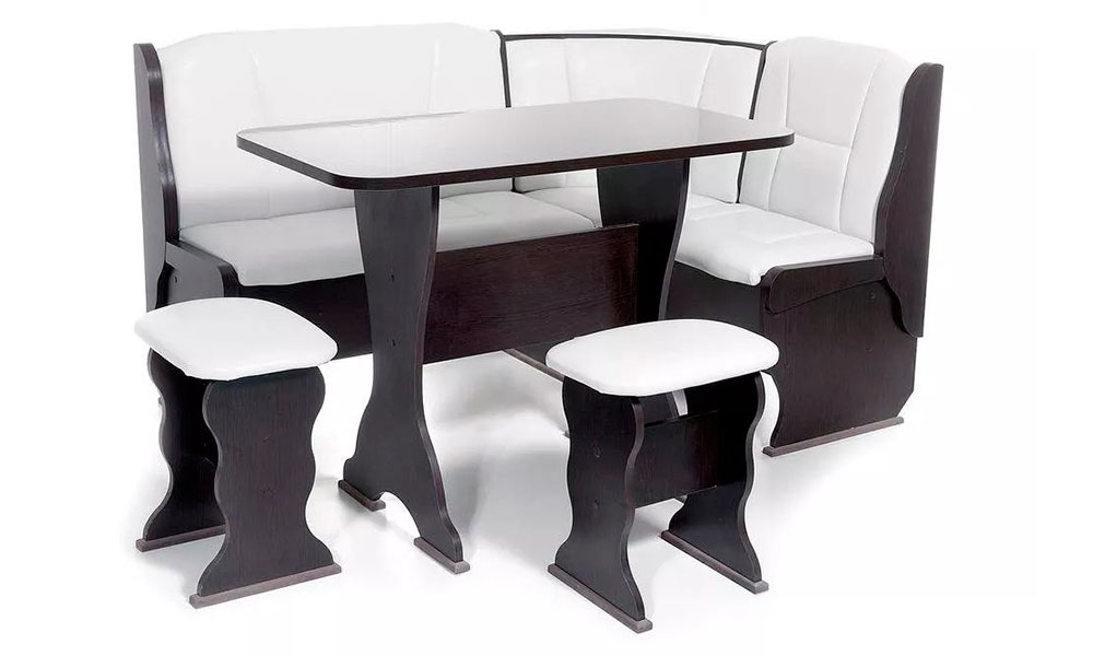 Кухонный набор Орхидея комплектация: угловой диван, стол, 2 табурета Размеры кухонного уголка: Д1500 x 1100; В840 мм Размеры стола: Д1000 x Ш600 х В750 мм. Размеры табурета: Д380 x Ш300 х В450 мм. Кухонный угловой диван с 2 ящиками. Сборка возможна на любую сторону. Столешница стола пластиковая термостойкая.