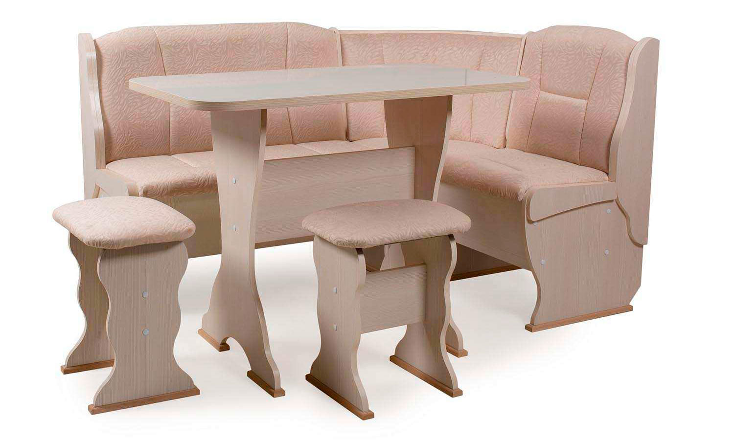 Кухонный набор Орхидея комплектация: угловой диван, стол, 2 табурета Размеры кухонного уголка: Д1500 x 1100; В840 мм Размеры стола: Д1000 x Ш600 х В750 мм. Размеры табурета: Д380 x Ш300 х В450 мм. Кухонный угловой диван с 2 ящиками. Сборка возможна на любую сторону. Столешница стола пластиковая термостойкая.