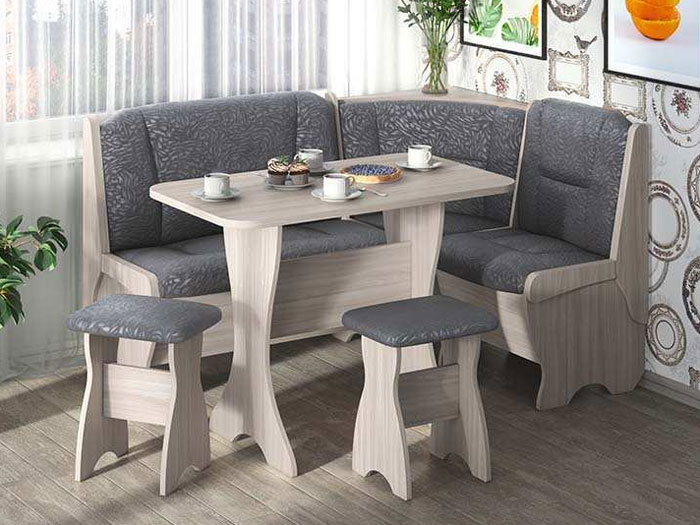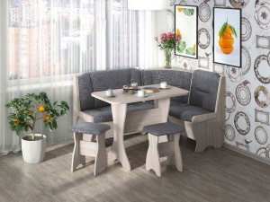 Кухонный набор Орхидея комплектация: угловой диван, стол, 2 табурета. Размеры кухонного уголка: Д150 x Ш110, В84 см. Размеры стола: Д100 x Ш60 х В75 см. Размеры табурета: Д38 x Ш30 х В45 см. Кухонный угловой диван с 2 ящиками под сидением (поднимается мягкая часть). Сборка возможна на любую сторону. Столешница стола пластиковая термостойкая.