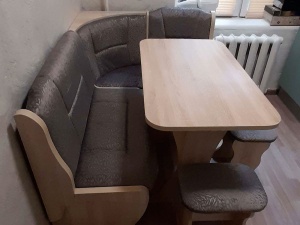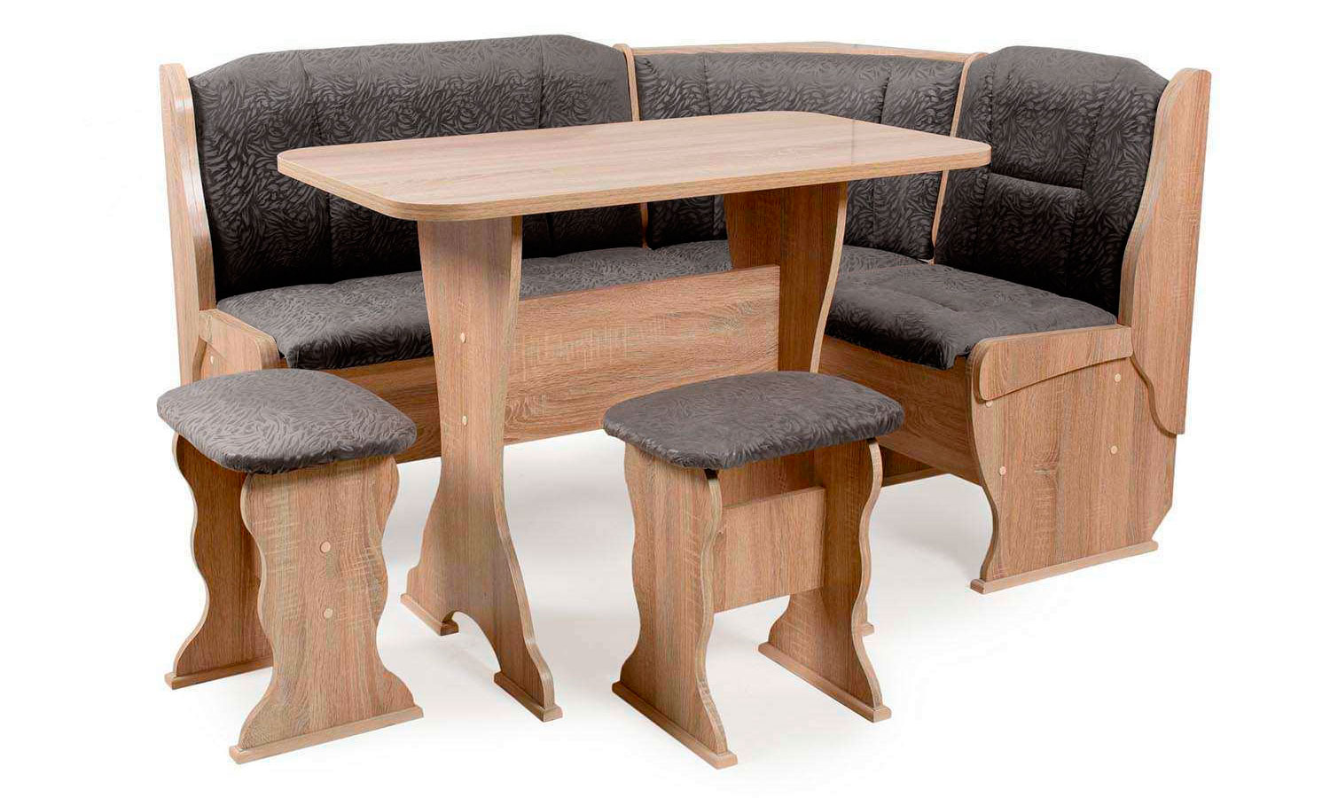 Кухонный набор Орхидея комплектация: угловой диван, стол, 2 табурета Размеры кухонного уголка: Д1500 x 1100; В840 мм Размеры стола: Д1000 x Ш600 х В750 мм. Размеры табурета: Д380 x Ш300 х В450 мм. Кухонный угловой диван с 2 ящиками. Сборка возможна на любую сторону. Столешница стола пластиковая термостойкая.