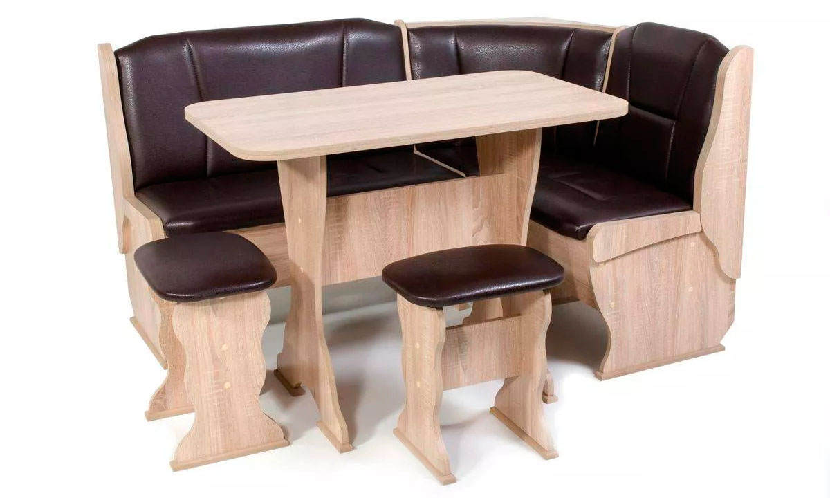 Кухонный набор Орхидея комплектация: угловой диван, стол, 2 табурета Размеры кухонного уголка: Д1500 x 1100; В840 мм Размеры стола: Д1000 x Ш600 х В750 мм. Размеры табурета: Д380 x Ш300 х В450 мм. Кухонный угловой диван с 2 ящиками. Сборка возможна на любую сторону. Столешница стола пластиковая термостойкая.