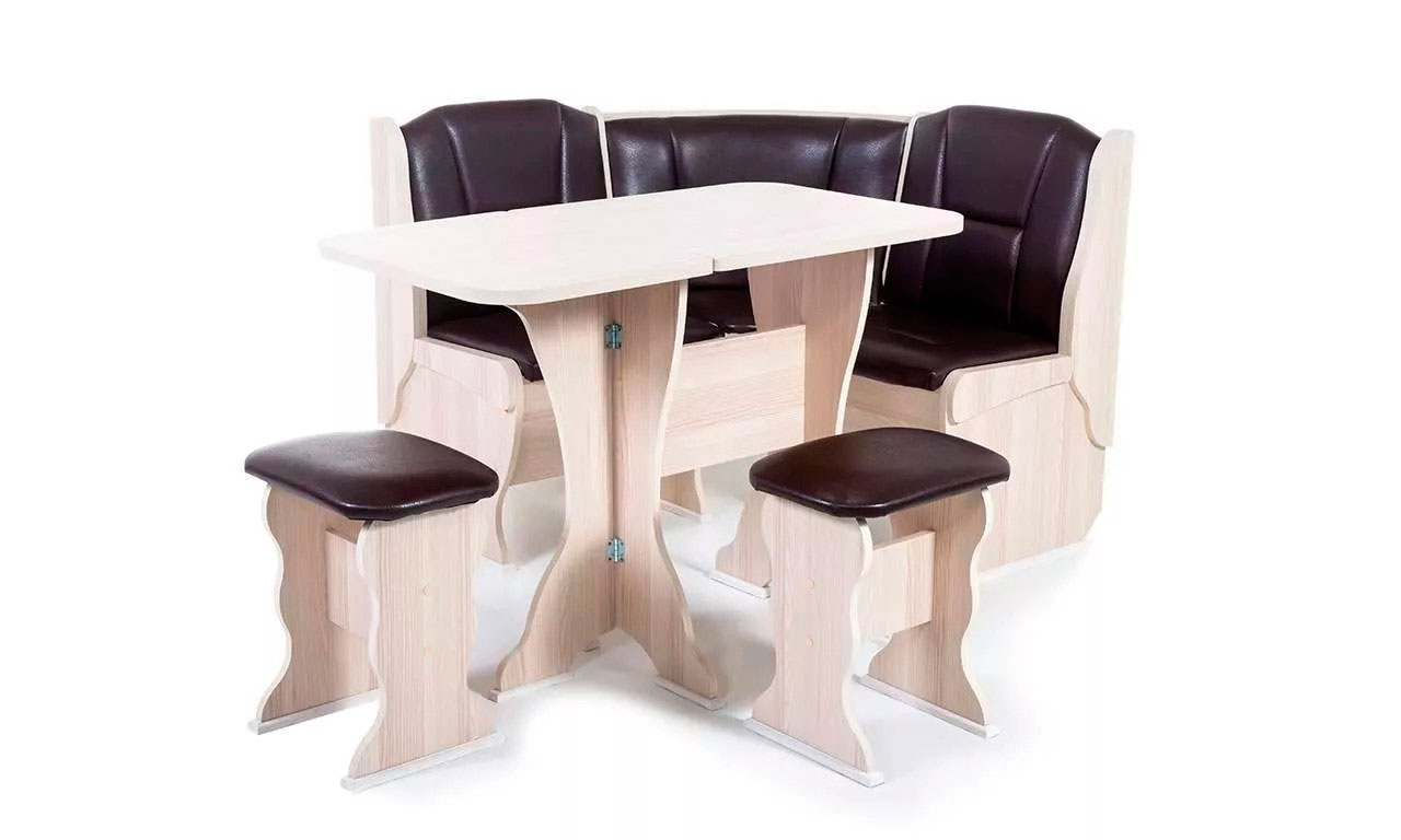 Скамьи и угловой сегмент имеют мягкие спинки и сиденья. Под сиденьями расположены вместительные ящики для хранения сопутствующих предметов.