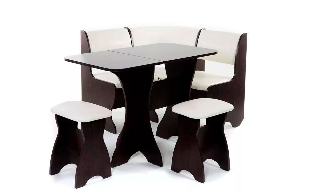 Удобный кухонный набор Тюльпан сделает Вашу кухню красивой и комфортной. Он удобен в пользовании, имеет мягкие сиденья и спинки, оборудован ящиками для хранения. В состав набора входят: уголок, стол и две табуретки с мягкими сиденьями. Стол выполнен с раскладной столешницей.