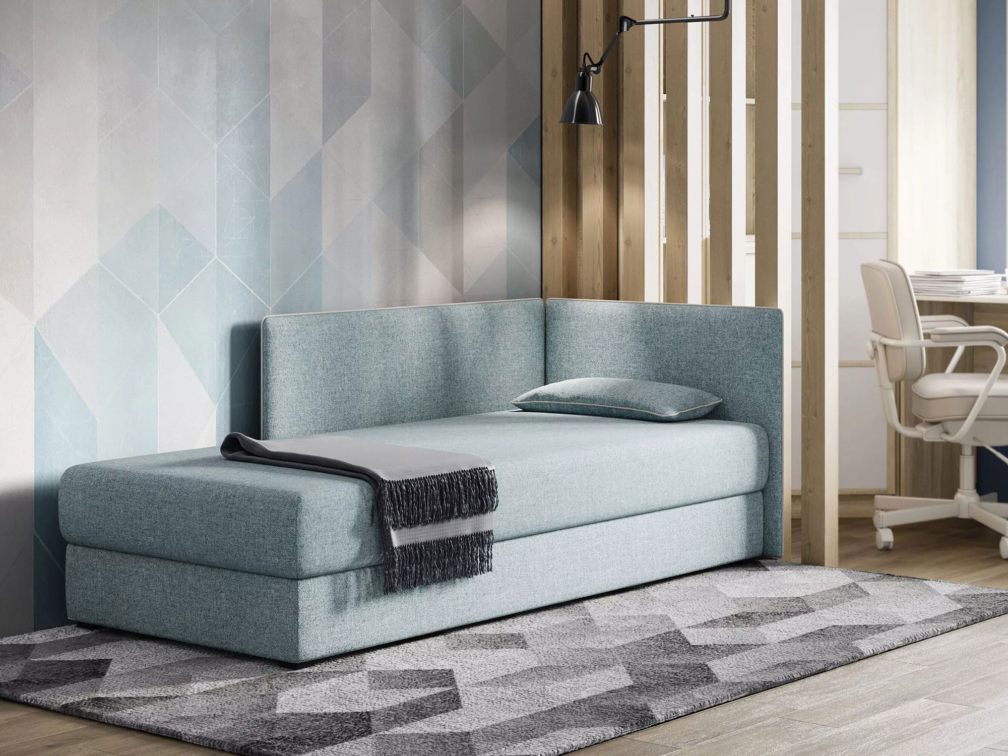 Тахта MИА представляет собой многофункциональную модель, обладающую двумя мягкими спинками, которые образуют эргономичный угол. Инновационный дизайн и высококачественные материалы, используемые в конструкции, обеспечивают ей статус функционального элемента интерьера, способного гармонично интегрироваться как в спальную, так и в гостиную зону. Данная модель оснащена односторонним несъемным матрасом, снабженным пружинным подъемным механизмом, что способствует повышению комфорта и удобства эксплуатации. Вместительный ящик для белья, расположенный в основании тахты, эффективно решает проблему оптимизации пространства, позволяя рационально использовать каждый квадратный метр помещения.