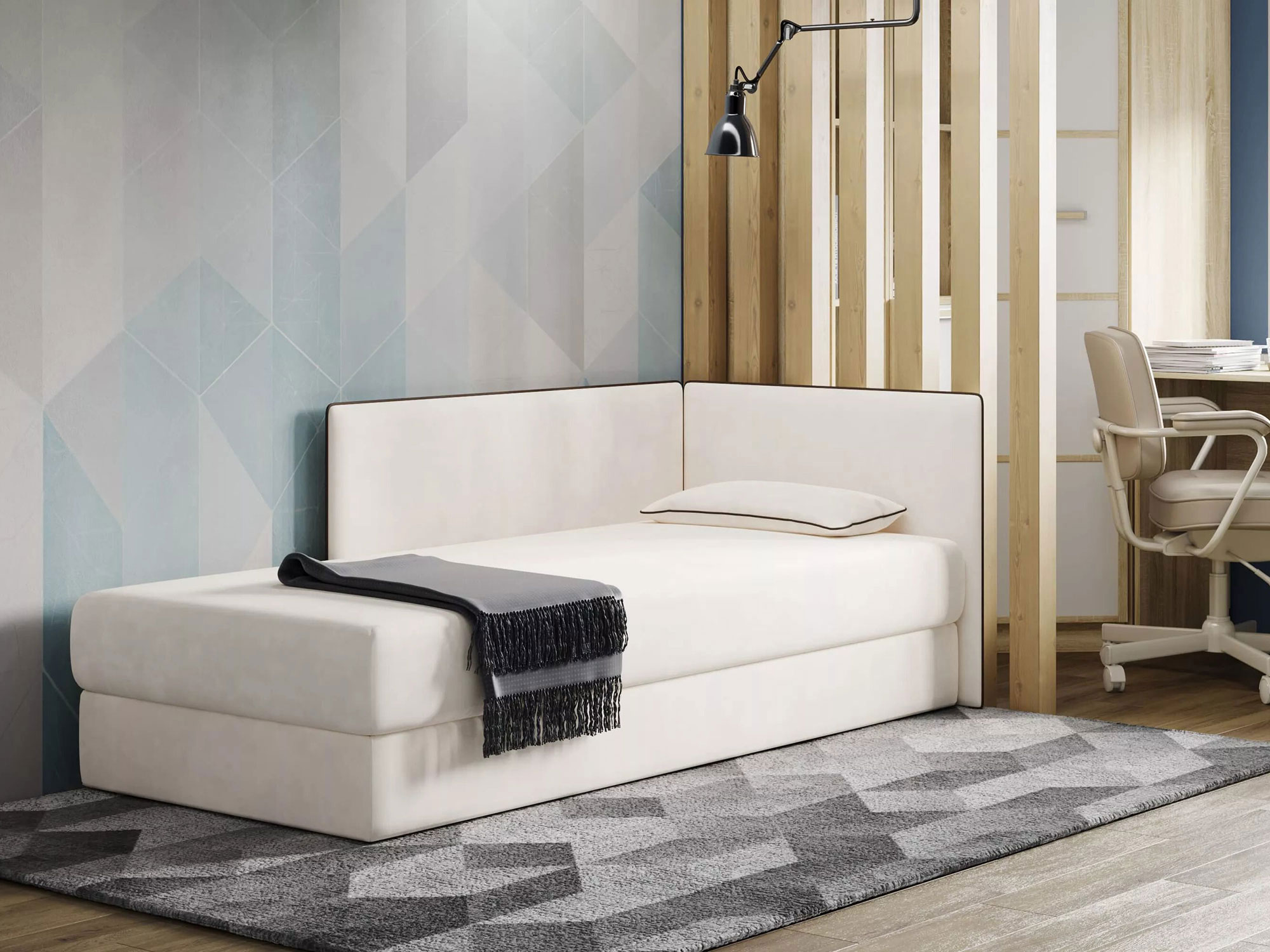 Тахта MИА представляет собой многофункциональную модель, обладающую двумя мягкими спинками, которые образуют эргономичный угол. Инновационный дизайн и высококачественные материалы, используемые в конструкции, обеспечивают ей статус функционального элемента интерьера, способного гармонично интегрироваться как в спальную, так и в гостиную зону. Данная модель оснащена односторонним несъемным матрасом, снабженным пружинным подъемным механизмом, что способствует повышению комфорта и удобства эксплуатации. Вместительный ящик для белья, расположенный в основании тахты, эффективно решает проблему оптимизации пространства, позволяя рационально использовать каждый квадратный метр помещения.