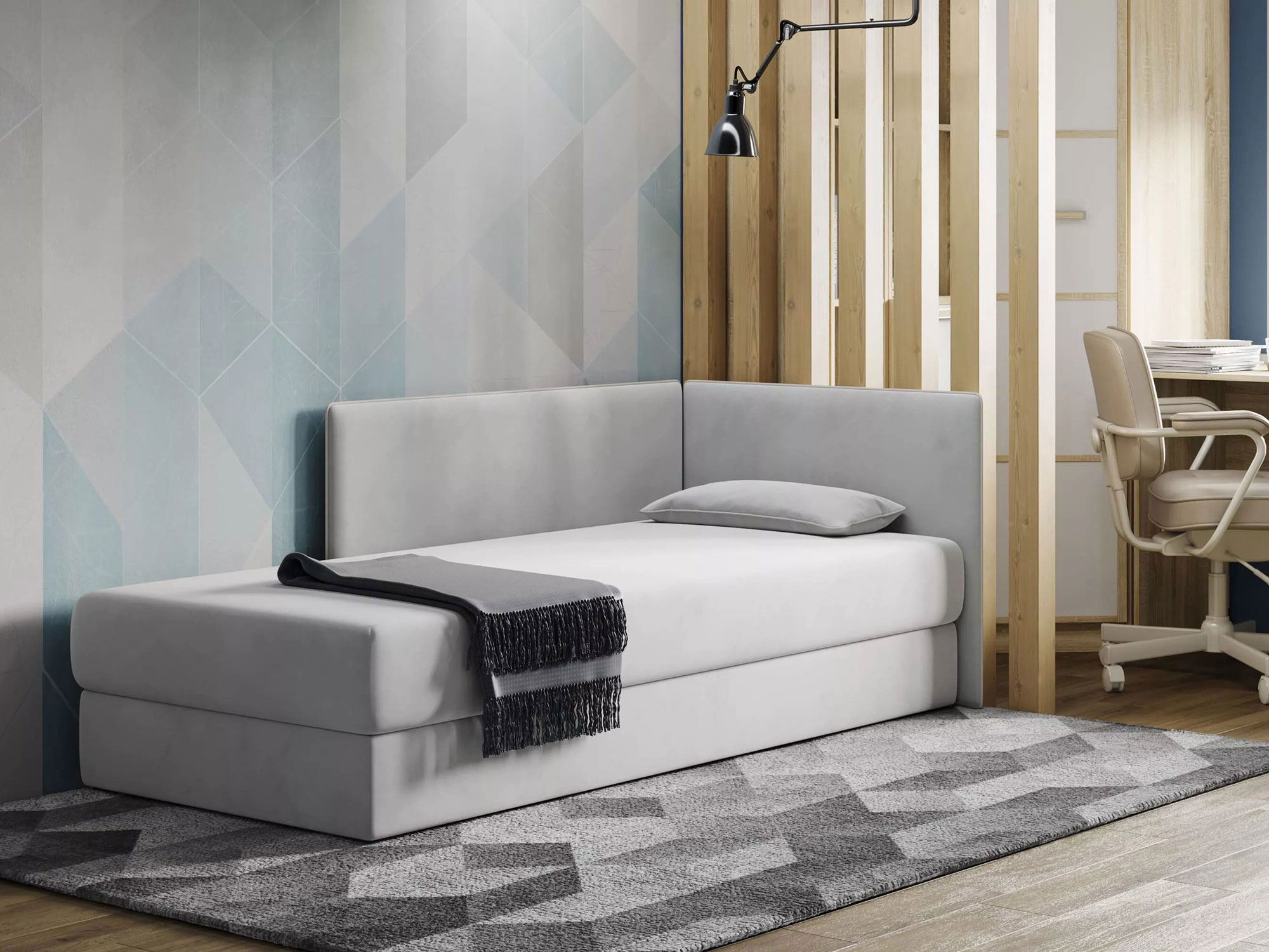 Тахта MИА представляет собой многофункциональную модель, обладающую двумя мягкими спинками, которые образуют эргономичный угол. Инновационный дизайн и высококачественные материалы, используемые в конструкции, обеспечивают ей статус функционального элемента интерьера, способного гармонично интегрироваться как в спальную, так и в гостиную зону. Данная модель оснащена односторонним несъемным матрасом, снабженным пружинным подъемным механизмом, что способствует повышению комфорта и удобства эксплуатации. Вместительный ящик для белья, расположенный в основании тахты, эффективно решает проблему оптимизации пространства, позволяя рационально использовать каждый квадратный метр помещения.