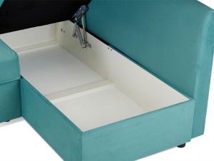Козетка с отделением для хранения оснащена крышкой, которая фиксируется в открытом положении, обеспечивая удобный и безопасный доступ к содержимому.