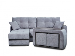 В комплект дивана входит подлокотник-«стол» с двумя пуфиками, которые компактно умещаются в нем. В качестве опор на подлокотнике использованы поворотные колеса что облегчает его перемещение. При необходимости подлокотник можно установить перед диваном, достать из него два пуфика и использовать подлокотник в качестве небольшого столика. Пуфы и подлокотник-«стол» можно использовать как автономно, так и в составе комплекта с диваном.