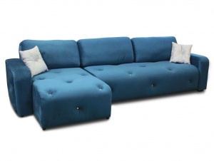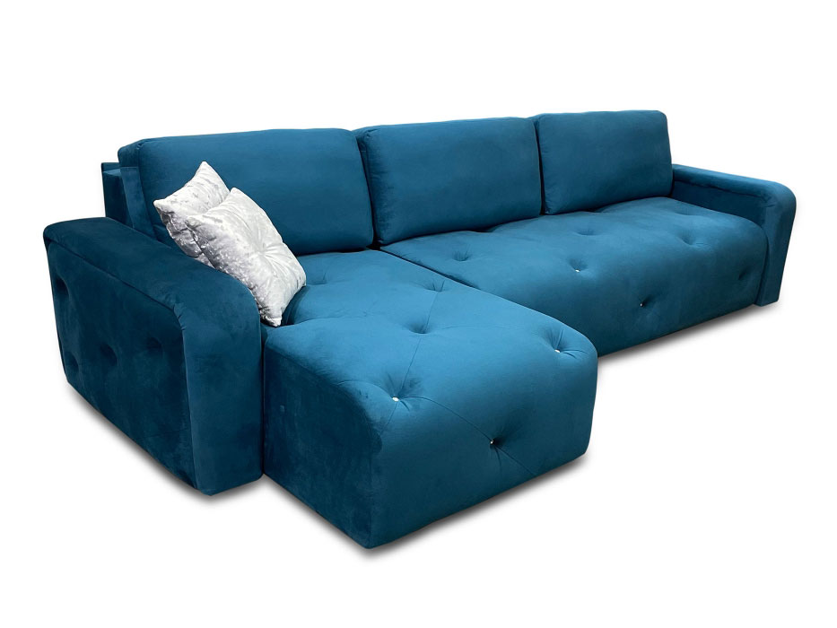 Стильный угловой диван с увеличенным по длине сиденьем и комфортным шезлонгом, декорированный ромбовидной утяжкой, пуговицами или стразами (стразы опция по желанию).