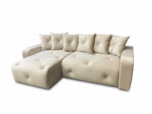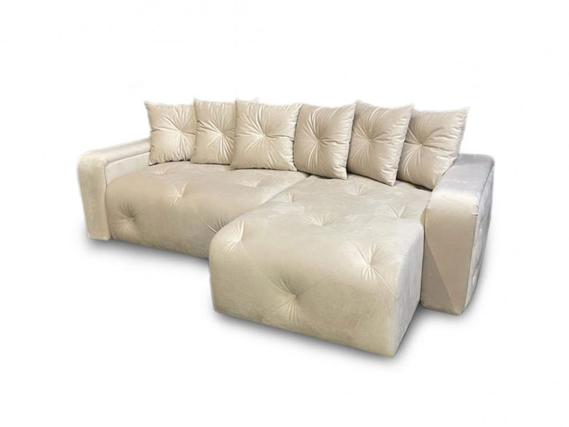 Стильный угловой диван с широким комфортным шезлонгом, декорированный ромбовидной глубокой утяжкой, пуговицами или стразами (по умолчанию ставятся пуговицы, стразы - опция по желанию).