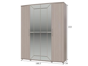 Шкаф с распашными дверями, с двух сторон отделение с тремя антресольными полками и горизонтальными штангами под ними. В центре шкаф украшают зеркала из 12-ти сегментов, внутри расположены антресольная полка, горизонтальная штанга и нижняя полка.