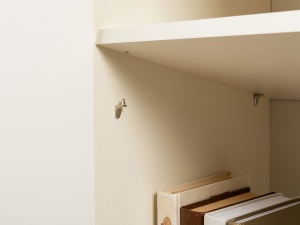 Конструктивная особенность шкафа заключается в наличии двух распашных дверей, обеспечивающих удобный доступ к внутреннему пространству. Внутреннее наполнение шкафа включает в себя несколько полок, предназначенных для хранения различных предметов.