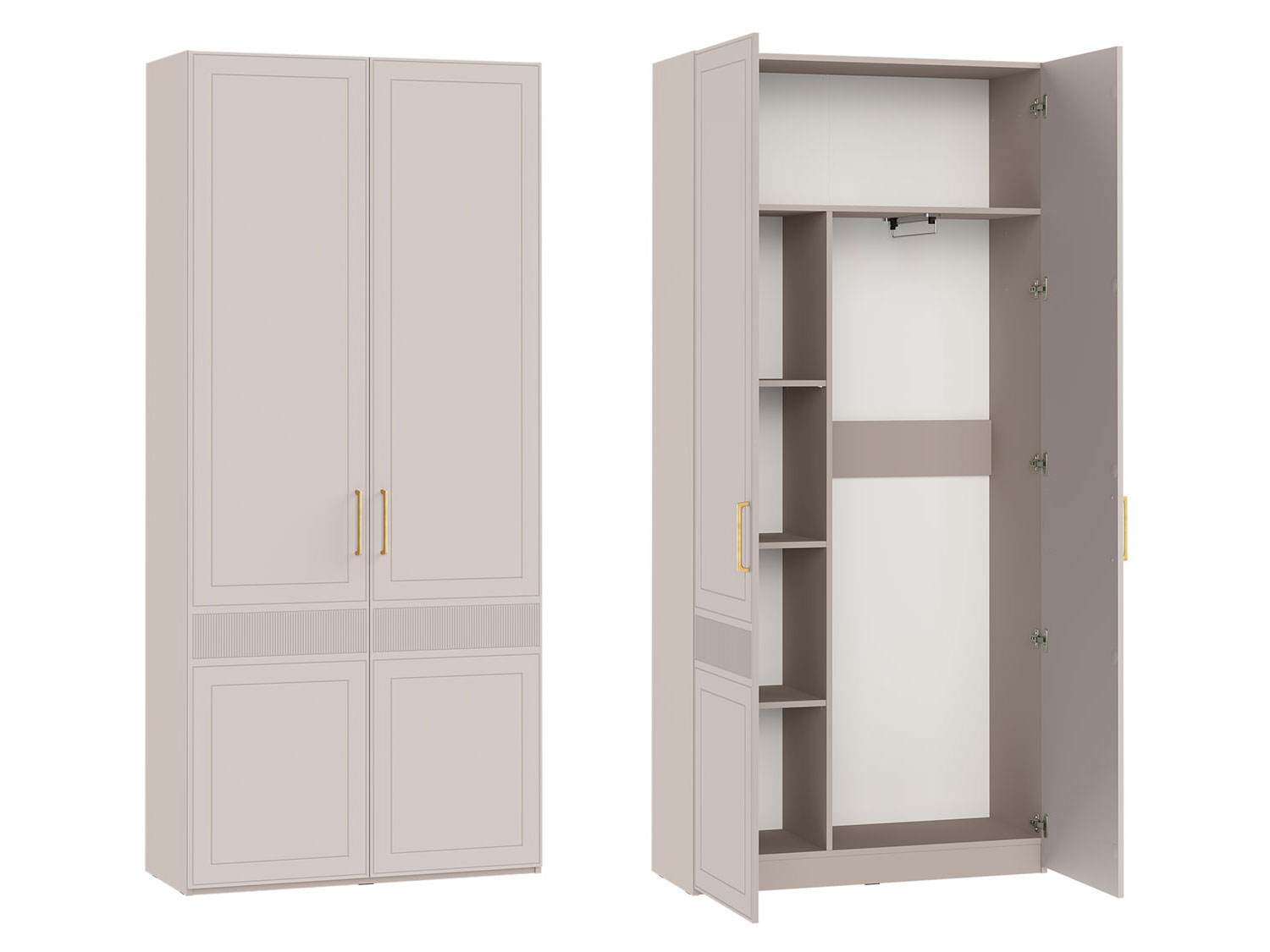 Внутреннее наполнение шкафа включает в себя полки и вешалку для одежды, что позволяет эффективно организовать хранение различных предметов гардероба, обеспечивая их сохранность и доступность.