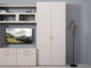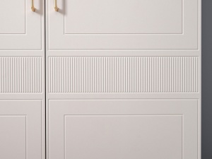 Фасады данной модели характеризуются оригинальной структурной композицией, которая придает изделию уникальный визуальный облик. Конструктивное решение шкафа предусматривает наличие двух глухих распашных дверей, обеспечивающих доступ к внутреннему пространству.