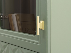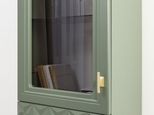 Фасады шкафа характеризуются утонченной отделкой, выполненной с использованием современных технологий. Конструкция шкафа предусматривает распашную дверцу, оснащенную стеклянной вставкой, что придает изделию эстетическую привлекательность и визуальную легкость.