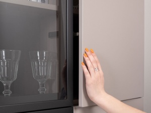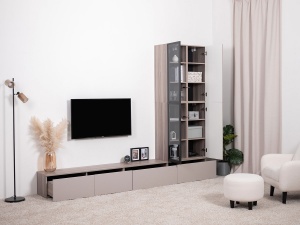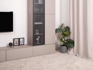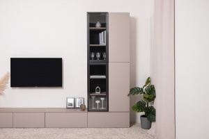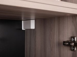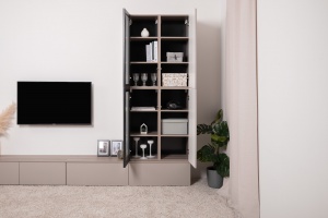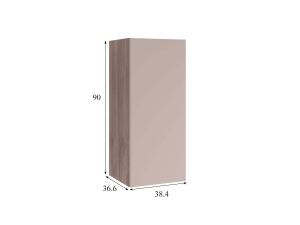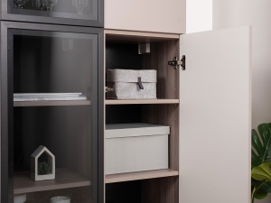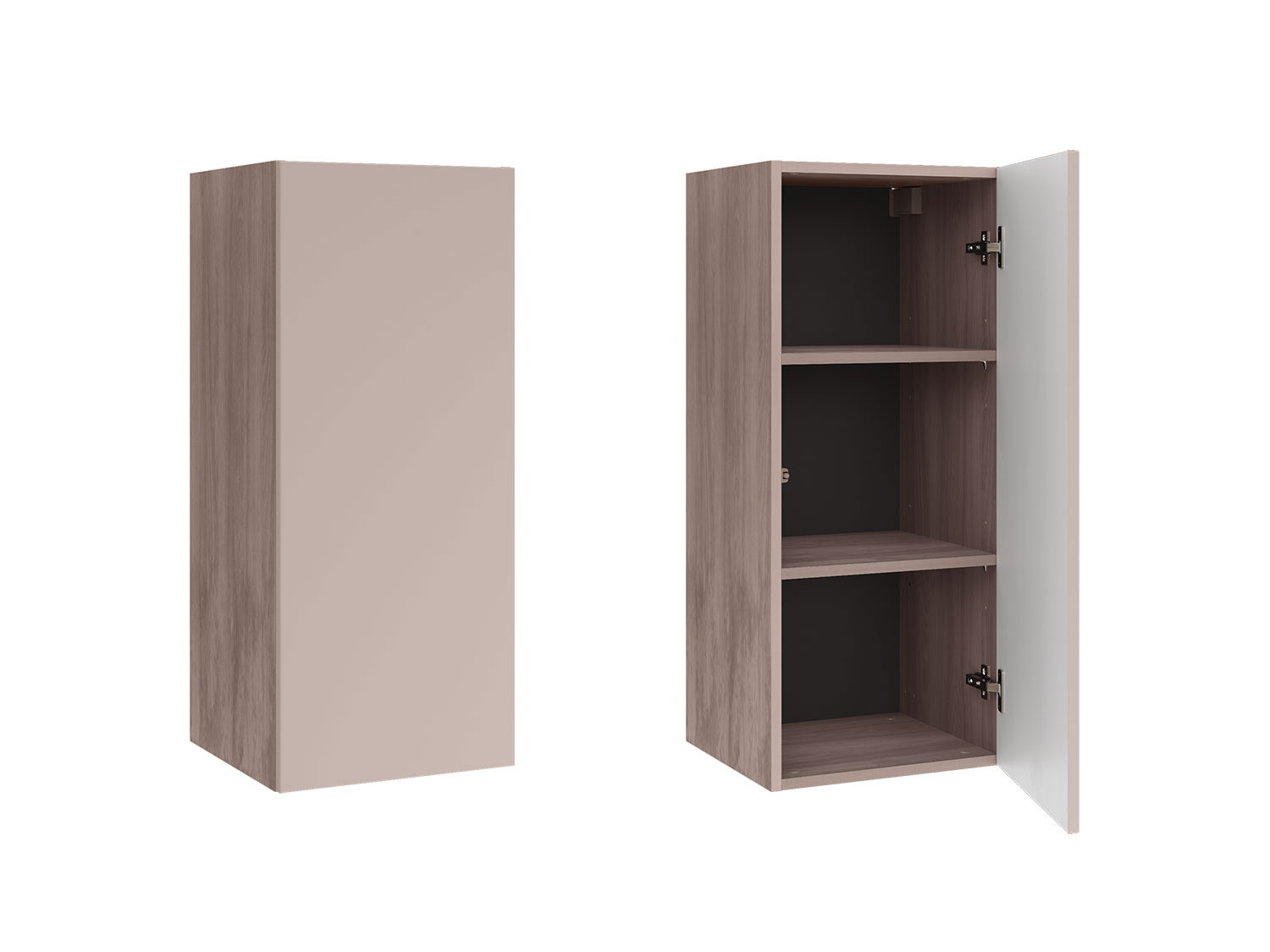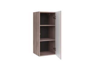 Шкаф оснащен одной распашной дверцей, за которой расположены регулируемые полки, предназначенные для организации хранения различных предметов. Распашные фасады оснащены механизмом push-to-open, обеспечивающим удобство использования без применения внешней фурнитуры.