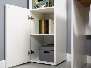 Конструкция стеллажа оснащена двумя глухими распашными дверцами, обеспечивающими доступ к внутреннему пространству. Внутреннее наполнение стеллажа включает четыре закрытые полки и две открытые, что позволяет эффективно организовать хранение различных предметов, учитывая их индивидуальные особенности и требования к доступности.