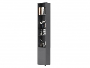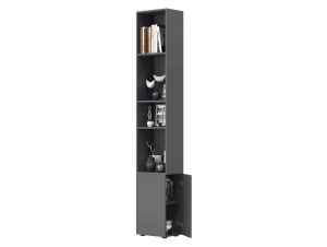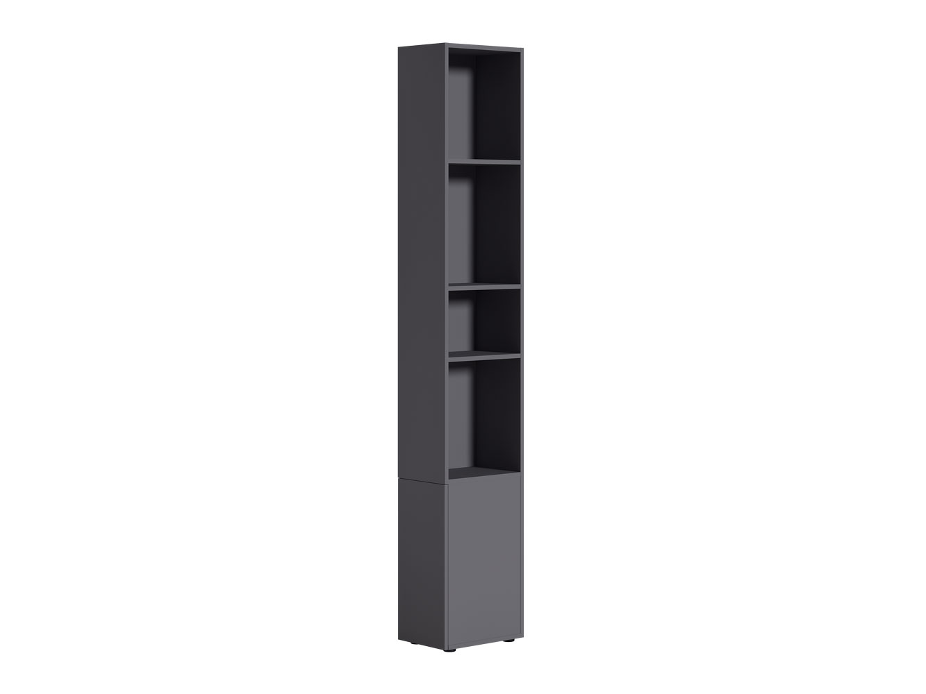 Конструктивные особенности шкафа включают в себя четыре открытые полки, расположенные в верхней части, что обеспечивает легкий доступ к содержимому и способствует оптимальной организации пространства. В нижней секции шкафа предусмотрена тумба с глухой дверцей, дополненная двумя полками, что позволяет эффективно использовать вертикальное пространство и обеспечивает дополнительную функциональность.