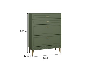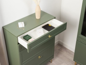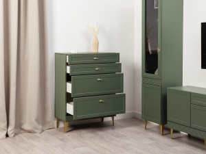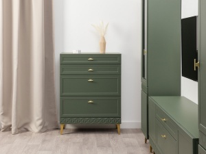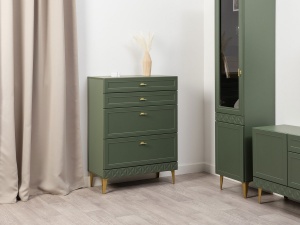 Функциональная составляющая комода также заслуживает внимания: он оснащен четырьмя выдвижными ящиками различной глубины, что обеспечивает удобство и рациональное использование внутреннего пространства. Металлические ручки и ножки не только придают комоду дополнительную прочность, но и гармонично вписываются в его общий дизайн, создавая цельный и завершенный образ.