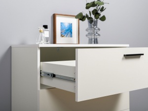 Данная модель оснащена тремя выдвижными ящиками, предназначенными для эффективного хранения различных предметов. Конструкция комода предусматривает использование шариковых направляющих полного выдвижения, что обеспечивает плавное и бесшумное открывание ящиков.
