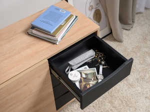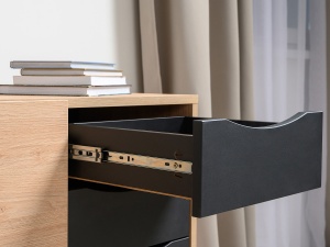 Данная модель демонстрирует высокую функциональность благодаря использованию металлических ручек с накаткой, регулируемым полкам и выдвижным ящикам, что обеспечивает удобство эксплуатации и простоту в уходе. Эргономичность и продуманность конструкции до мельчайших деталей делают комод Брюс идеальным выбором для современных жилых пространств, где важны как эстетические, так и практические характеристики мебели.