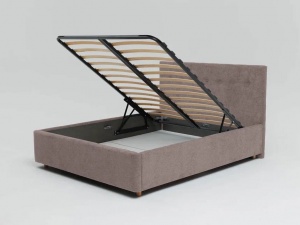 Кровать оснащена ортопедическим основанием, выполненным на базе деревянных ламелей, что гарантирует оптимальную поддержку позвоночника и способствует улучшению качества сна. В конструкцию также интегрирован подъёмный механизм, который позволяет эффективно использовать пространство под кроватью, обеспечивая наличие вместительного ящика для хранения постельного белья и других предметов домашнего обихода.