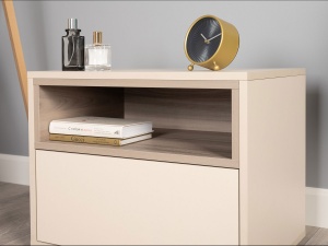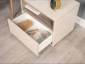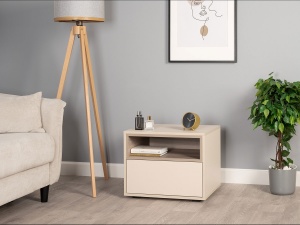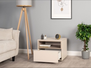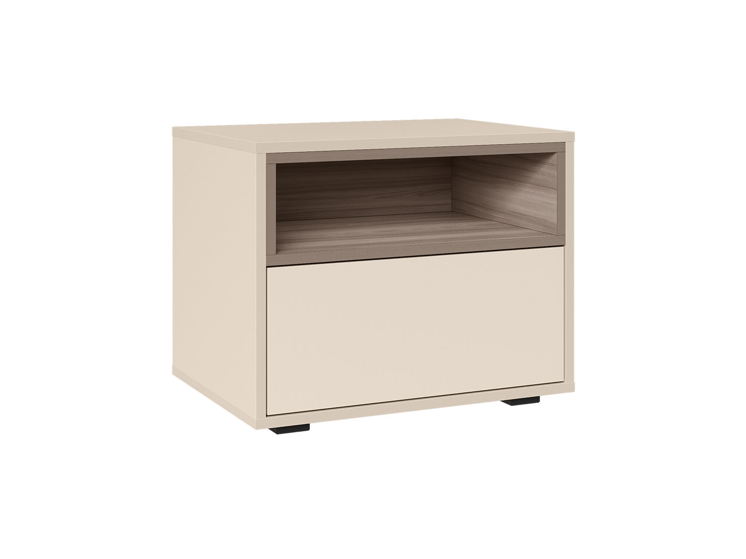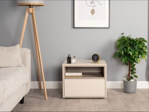 Конструктивно тумба оснащена выдвижным ящиком с push-механизмом, который обеспечивает плавное и бесшумного открывание. Это решение позволяет эффективно использовать внутреннее пространство и повышает комфорт эксплуатации. Открытая ниша предоставляет возможность для удобного размещения мелких предметов, книг или декоративных элементов, что способствует оптимизации хранения и созданию эстетически привлекательной композиции.